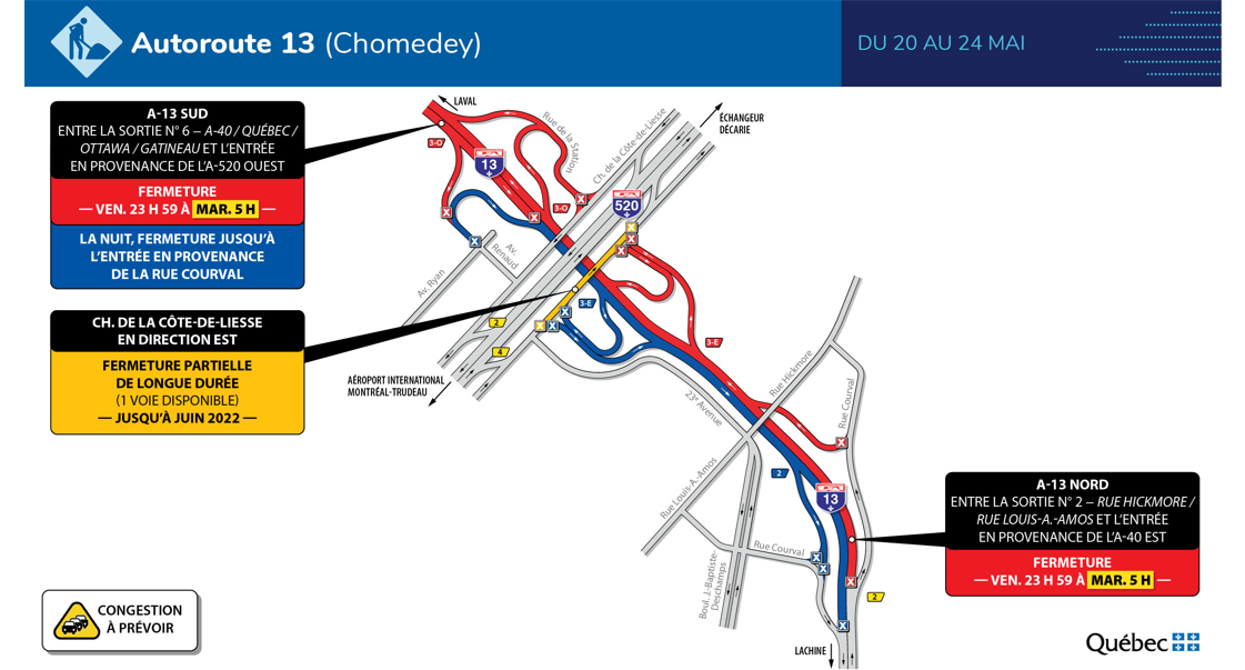 Prévoyez vos déplacements : fermeture de l’autoroute 13 du 20 au 24 mai 2022