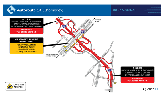 Du 27 au 30 mai 2022, le ministère des Transports entreprendra des travaux routiers, ce qui causera la fermeture complète de l’autoroute 13, dans les deux directions.