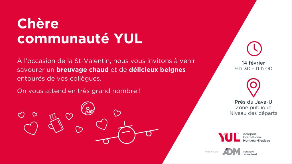 Vous êtes donc chaleureusement invités, le 14 février prochain, à venir partager un breuvage chaud et des beignes avec vos collègues de la grande communauté YUL.