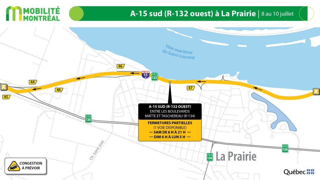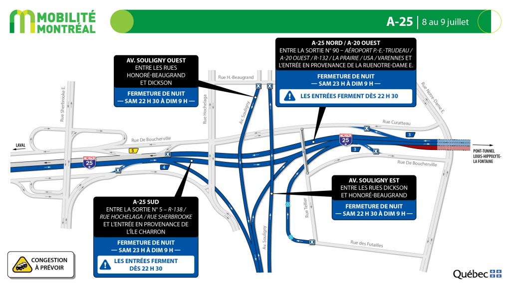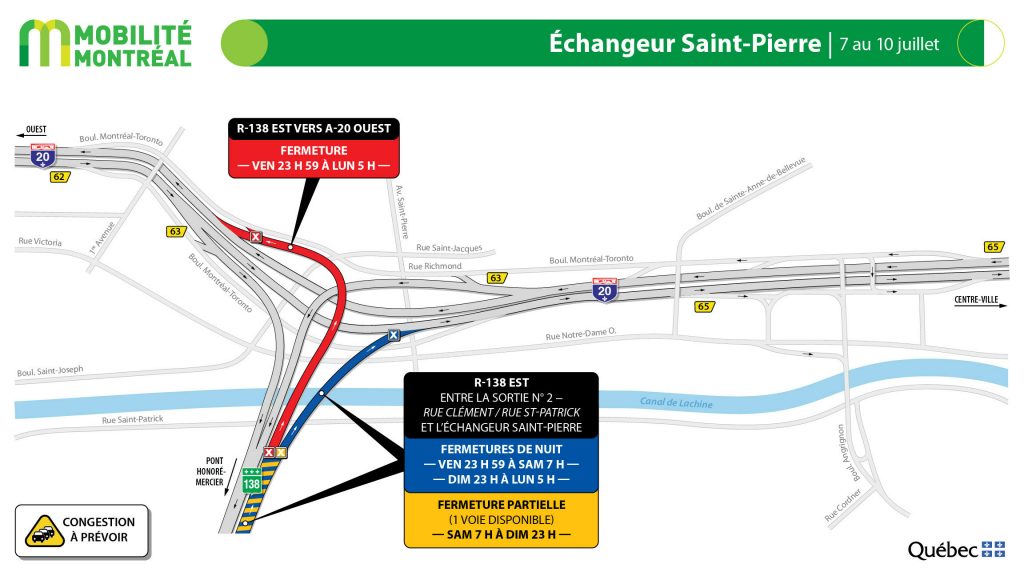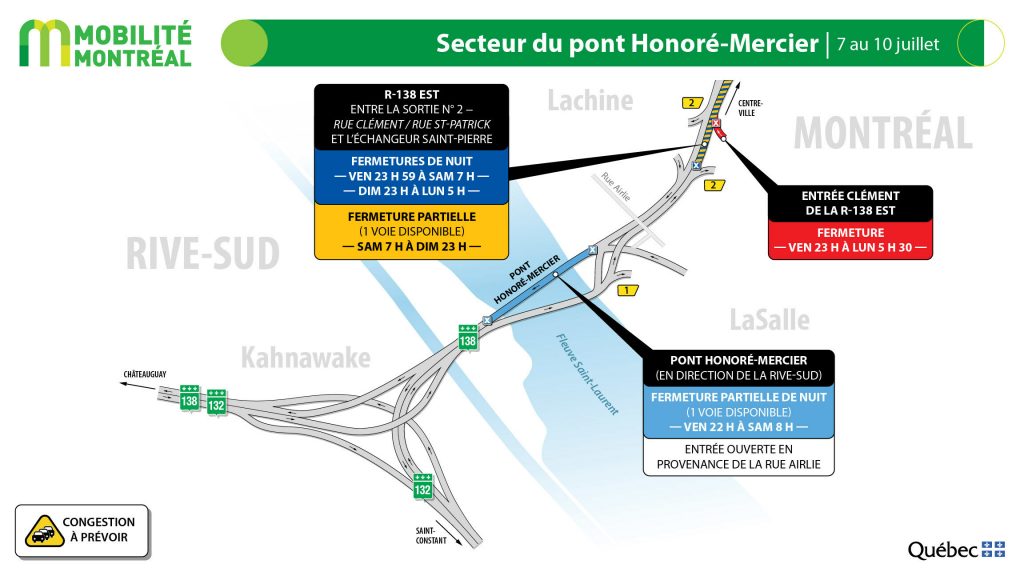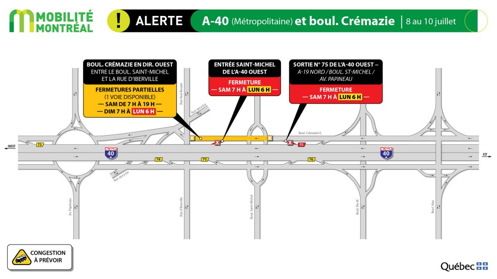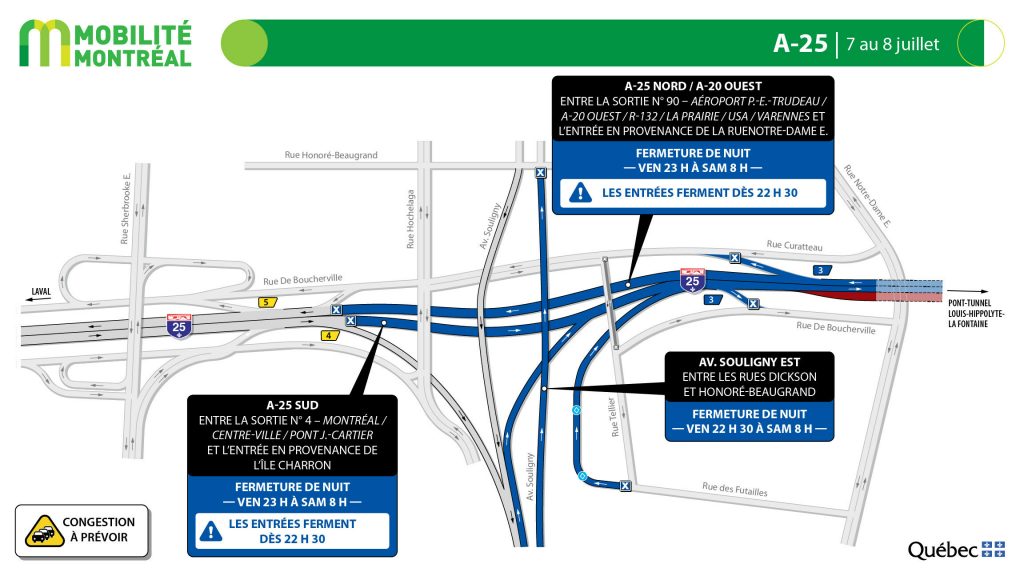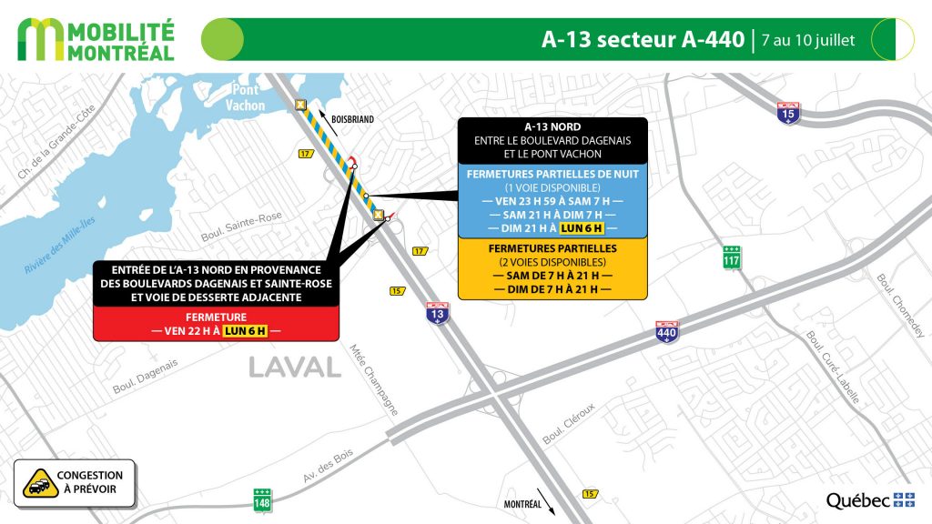 Du 7 au 10 juillet 2023, le ministère des Transports et de la Mobilité durable informe les usagers de la route que des entraves majeures seront mises en place durant la fin de semaine, notamment dans le tunnel Louis-Hippolyte-La Fontaine, sur le boulevard Crémazie, dans l’échangeur Saint-Pierre, sur l’autoroute 13 en direction nord à Laval et sur l’autoroute 15 en direction sud à La Prairie.