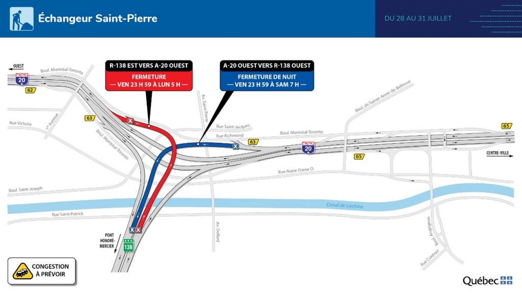 Fermeture de la bretelle de l’échangeur Saint-Pierre menant du pont Honoré-Mercier vers l’autoroute 20 en direction ouest (et vers Dorval et l’aéroport). Dans la nuit de vendredi (23 h 59) à lundi 5 h.