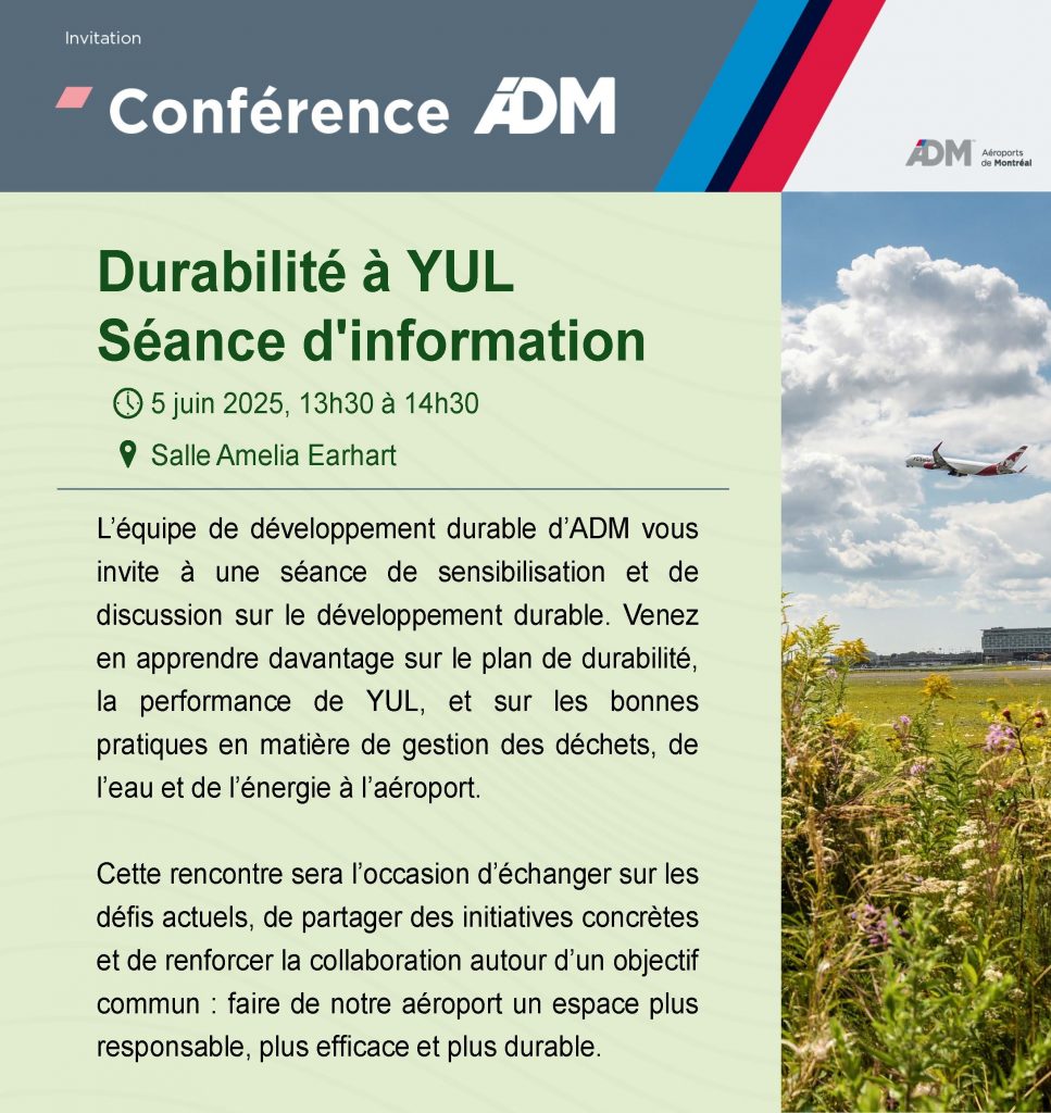 La Journée internationale de l’environnement, célébrée chaque année le 5 juin, représente la plus grande plateforme mondiale de sensibilisation du public en la matière. C’est ainsi que l’équipe de développement durable d’ADM en profite pour inviter les membres de la communauté aéroportuaire à une séance de sensibilisation sur ce qui se fait à YUL en matière de développement durable, que ce soit en matière de durabilité, de gestion des déchets, de l’eau et de l’énergie.