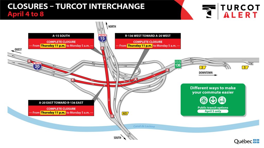 Major road closures will be in effect in the Turcot interchange from Thursday evening, April 4, to Monday morning, April 8. Difficult traffic conditions are to be expected on the road network, especially on Friday, April 5.