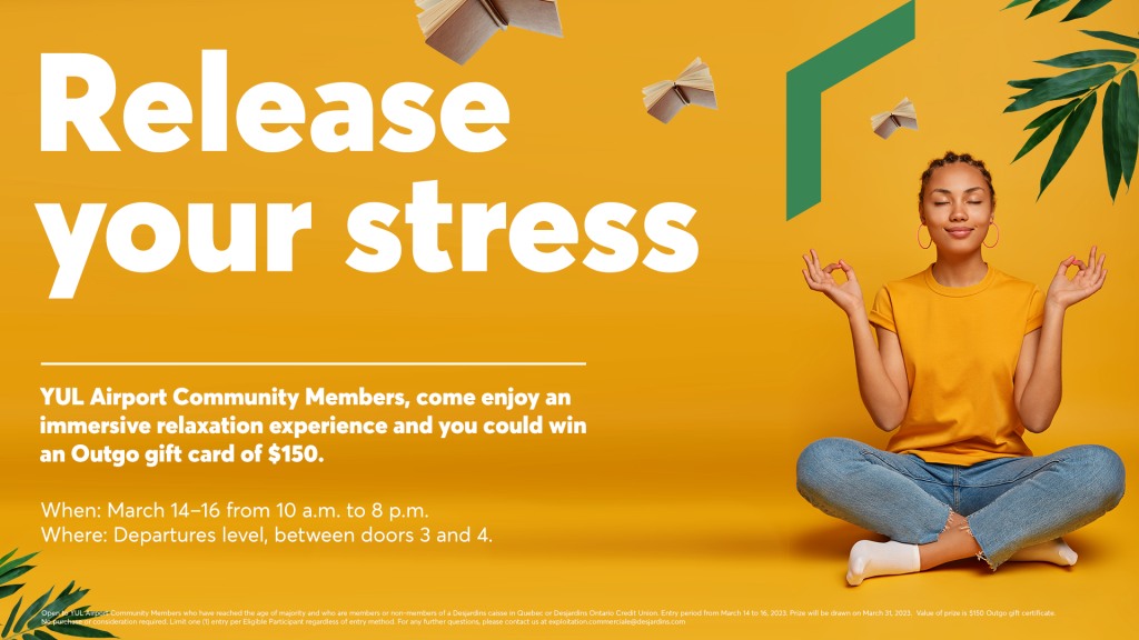For airport community members, sessions on March 14, 15 and 16 from 10 a.m. to 8 p.m. at YUL departures level, between doors 3 and 4 (in front of the elevators next to the information desk).